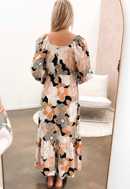 Tie Waist Puff Sleeve Bold Floral Maxi Dress