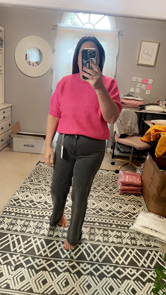 MELANGE PUFF SHORT SLEEVE ROUND NECK SWEATER-HOT PINK